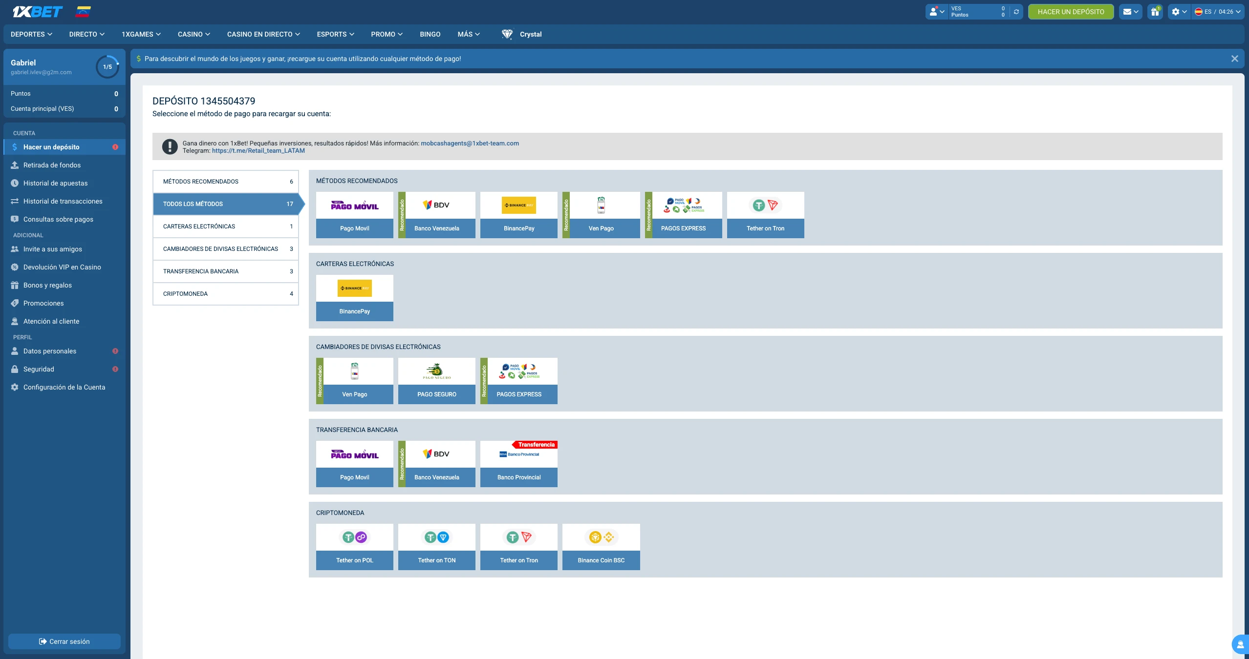 Cuando entré en la sección “Hacer un depósito”, me sorprendió la cantidad de métodos de pago disponibles. Yo decidí usar Pago Móvil, pero vi que también están: