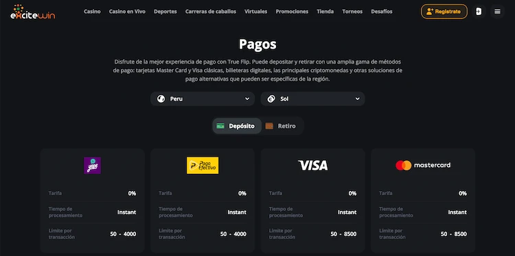 Si bien esto no sucede en todos los países, a la hora de hacer nuestra apuesta online en Perú, nos encontramos con la buena noticia de que ExciteWin acepta depósitos en efectivo a través de PagoEfectivo y en Chile a través de Sencillito. Ahora bien, en términos generales la forma más rápida de depositar siempre será usando nuestros monederos electrónicos o nuestras tarjetas.
