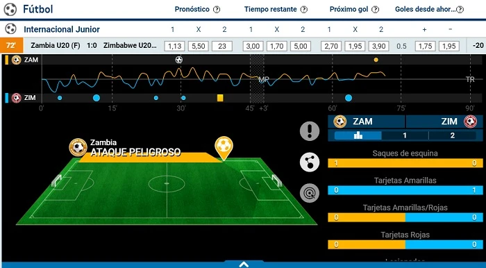 Siguiendo el hilo de las estadísticas, en una apuesta en vivo puedes ver la evolución del partido sobre un terreno de juego dibujado y la actualización de datos de ambos contendientes.