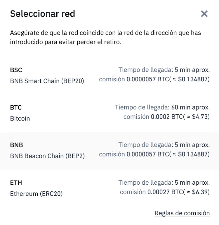 Si por el contrario nos hemos inclinado por hacer nuestro depósito de apuestas usando BTC, veremos no sólo que el número de redes disponibles es menor, sino que en algunos casos la comisión que deberemos asumir es un poco más alta. Nos encontraremos con una pantalla con este aspecto:
